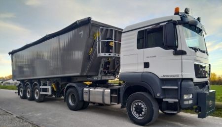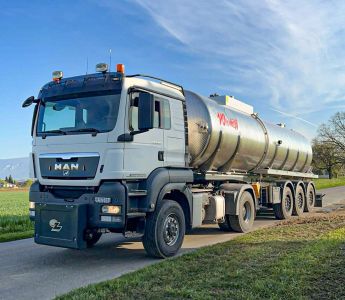 Mit unserem Sattelschlepper und 28,5m3 Wienhoff Tank Auflieger oder 50m3 Kipp-Auflieger können wir, ob fest oder flüssig, Transporte aller Art durchführen.